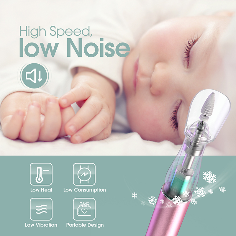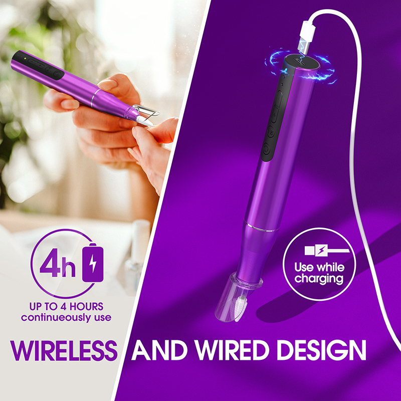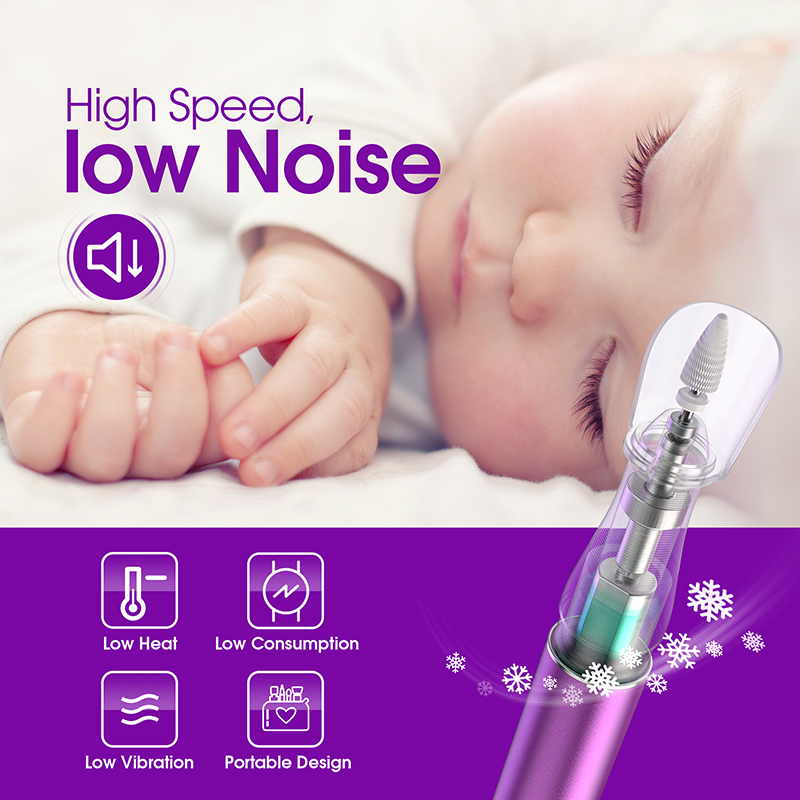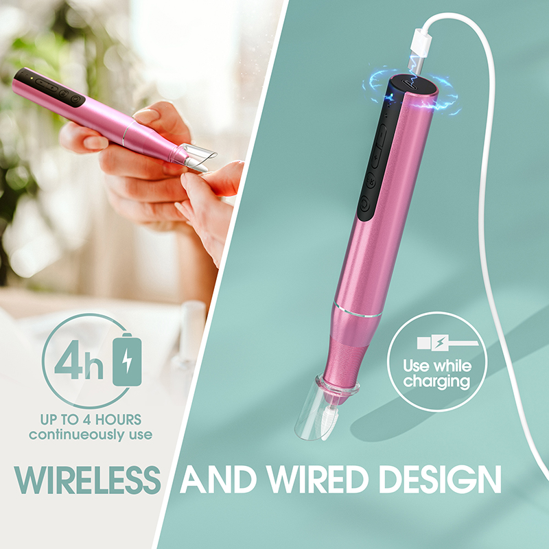 Ez az elektromos körömfúró a legújabb alumínium testtel rendelkezik, rezgéscsillapító kialakítással, amely hatékonyan csökkenti a zajt és a hőt a körmök csiszolásakor, így biztosítva, hogy senkit ne zavarjon körmének polírozása közben. Az ergonomikus toll alakú megjelenés kényelmes, csúszásmentes fogást biztosít, és lehetővé teszi a zselés körmök könnyű eltávolítását.