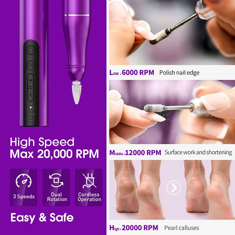 A professzionális körömreszelőt 3 sebességgel tervezték, 6000-12000-20000 között, csak röviden nyomja meg a + vagy - gombot a sebesség növeléséhez vagy csökkentéséhez. Könnyen állítható a sebesség és időt takaríthat meg a köröm élezésekor. A fúró iránya egyszerűen változtatható az F/R gomb megnyomásával, ideális balkezeseknek, mesterkörmösöknek vagy kezdő körömápoláshoz.