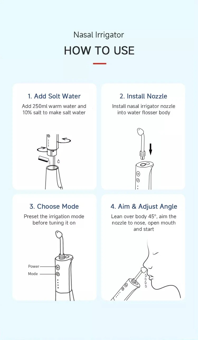 Hatékony orröblítés: Az elektromos orröblítők az orrjáratok hatékony és alapos öblítését kínálják, elősegítve a nyálka, allergének és törmelékek hatékonyabb kiöblítését, mint a kézi módszerek. Kényelem: Az elektromos orröblítők áramellátásukkal és állítható beállításokkal kényelmes megoldást nyújtanak orröblítéshez, a felhasználók időt és erőfeszítést takarítanak meg a kézi öntözési technikákhoz képest.Testreszabás: Az elektromos orröblítők állítható beállításai lehetővé teszik a felhasználók számára, hogy az öntözési élményüket egyéni igényeiknek, preferenciáiknak és kényelmi szintjüknek megfelelően testreszabják.