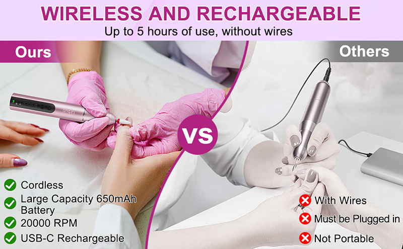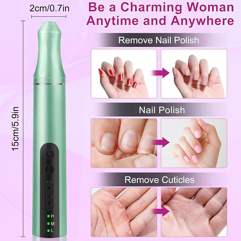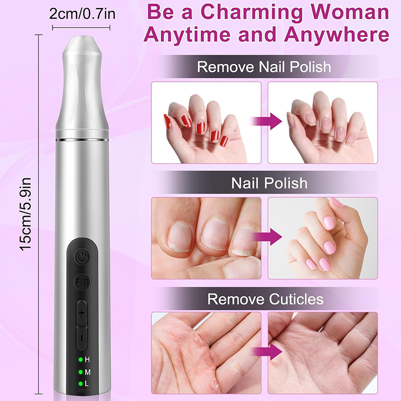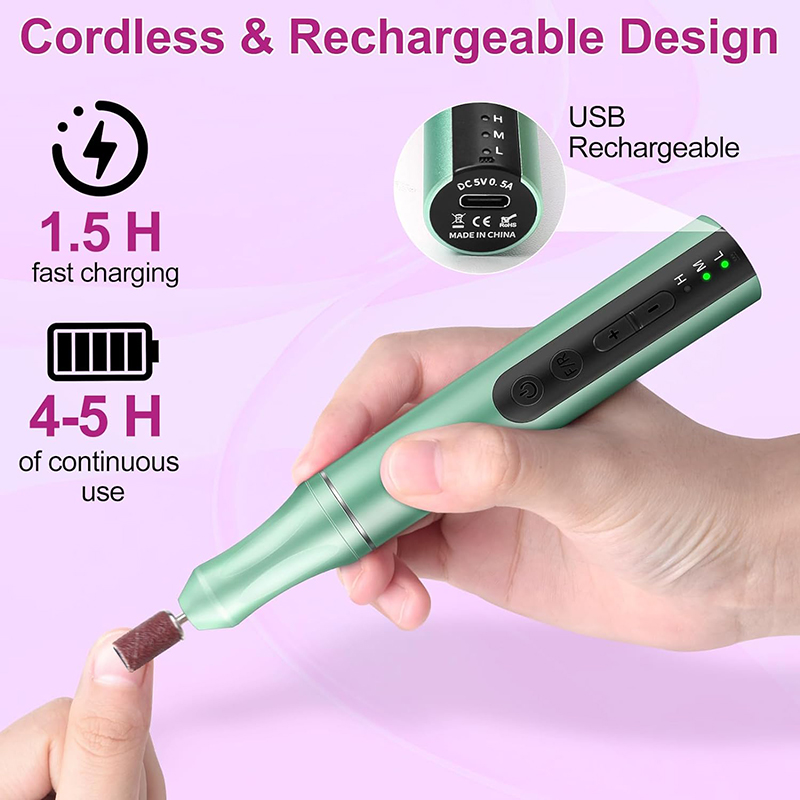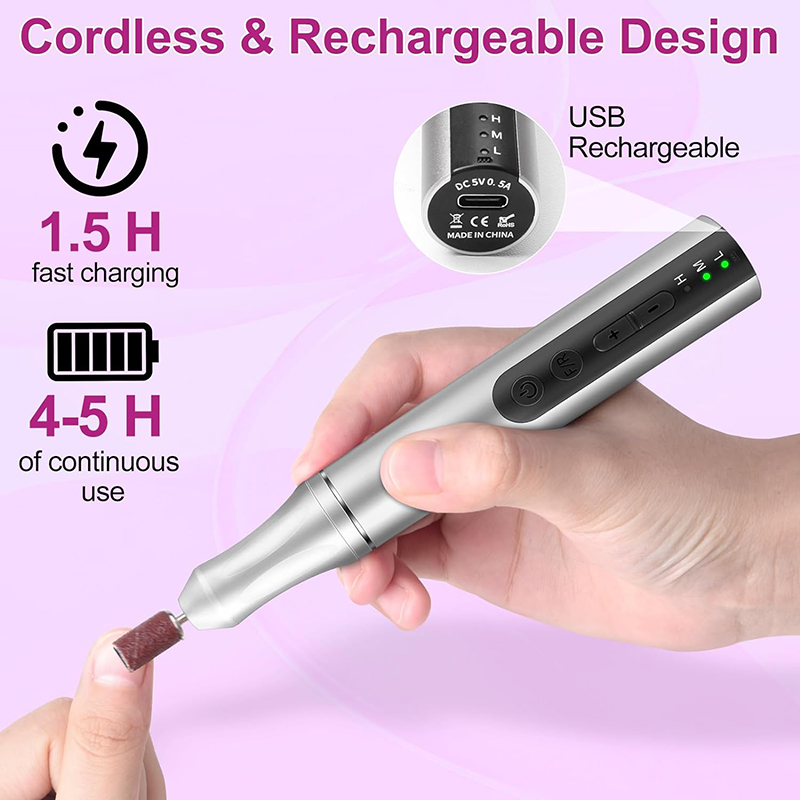 Az akril körmökhöz való körömfúrót úgy tervezték, hogy könnyű legyen (85 g), és elférjen a pénztárcájában vagy a ruhazsebében. Tartozik hozzá egy USB töltőkábel is, amely könnyedén csatlakoztatható bármely USB-eszközhöz a töltéshez, így kényelmesen élvezheti körömápolását bárhol és bármikor.