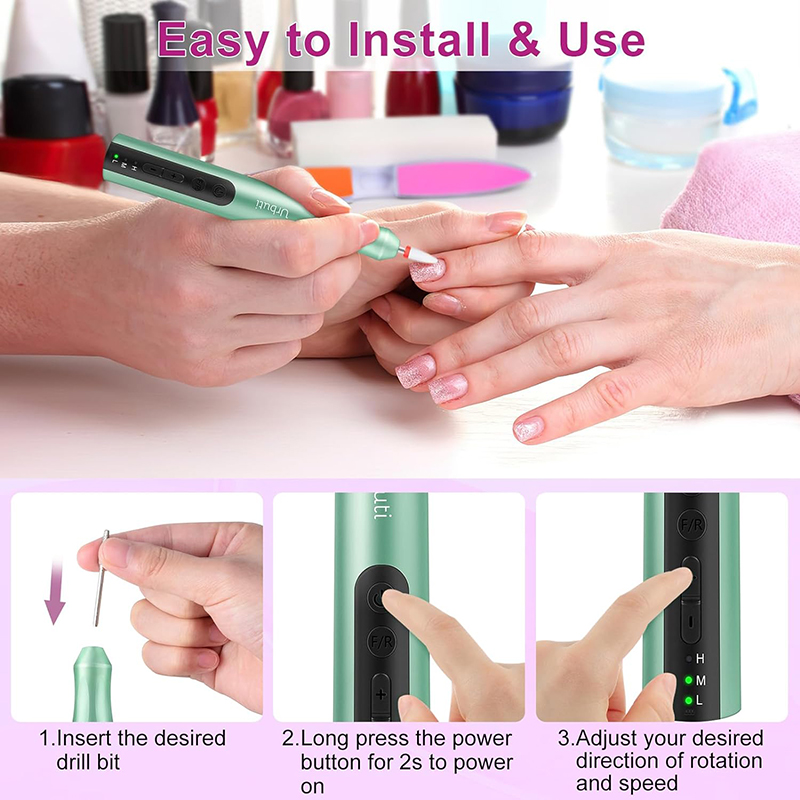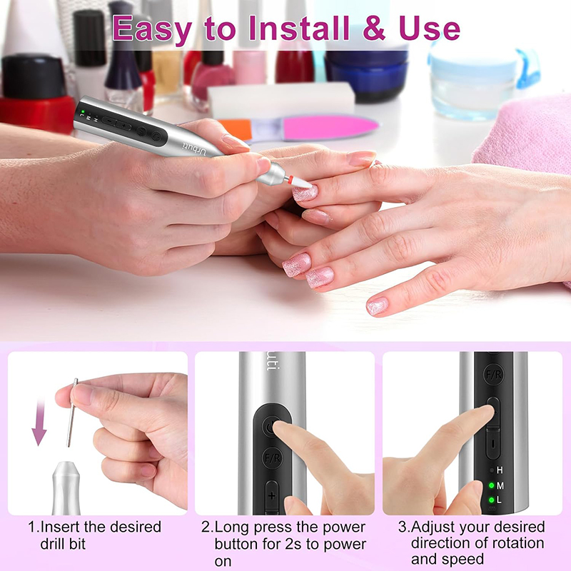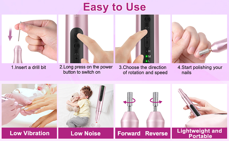 Ez az elektromos körömfúró a legújabb alumínium testtel rendelkezik, rezgéscsillapító kialakítással, amely hatékonyan csökkenti a zajt és a hőt a körmök csiszolásakor, így biztosítva, hogy senkit ne zavarjon körmének polírozása közben. Az ergonomikus toll alakú megjelenés kényelmes, csúszásmentes fogást biztosít, és lehetővé teszi a zselés körmök könnyű eltávolítását.