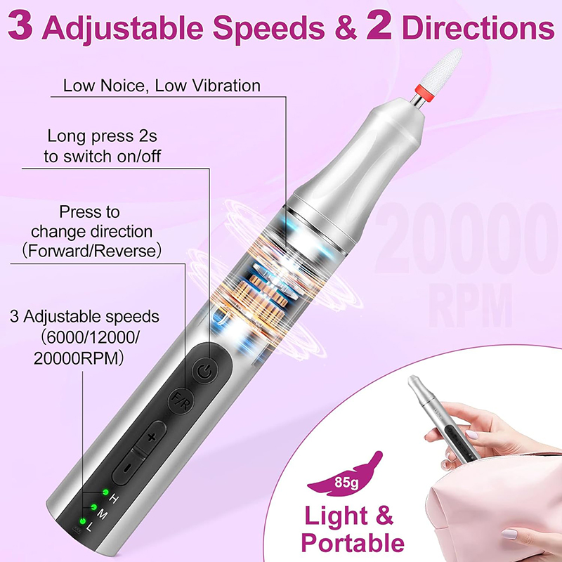 A professzionális körömreszelőt 3 sebességgel tervezték, 6000-12000-20000 között, csak röviden nyomja meg a + vagy - gombot a sebesség növeléséhez vagy csökkentéséhez. Könnyen állítható a sebesség és időt takaríthat meg a köröm élezésekor. A fúró iránya egyszerűen változtatható az F/R gomb megnyomásával, ideális balkezeseknek, mesterkörmösöknek vagy kezdő körömápoláshoz.