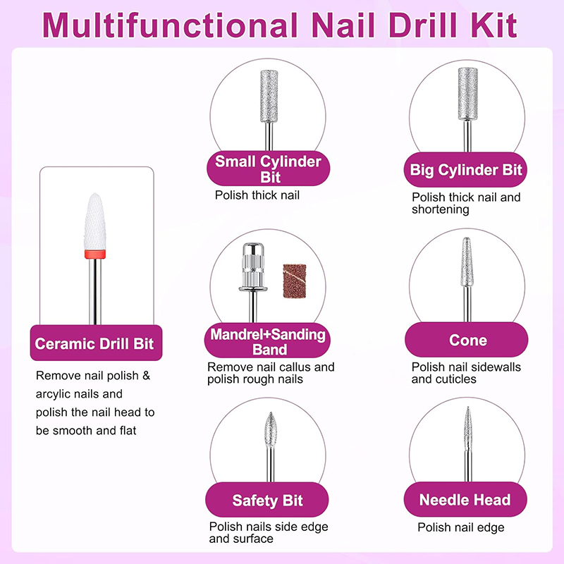 A szögfúró gép 6 rozsdamentes acél szögfúrót, 1 kerámia fúrót és 36 cserélhető csiszolócsíkot tartalmaz. A manikűr pedikűr készlet használható manikűrhöz, pedikűrhöz, polírozáshoz, formázáshoz, kutikula csiszolásához, akril/gél köröm eltávolításhoz vagy köröm szépségápoláshoz. Tartozékokkal komplett és könnyen használható, tökéletes körömművészet kezdőknek!