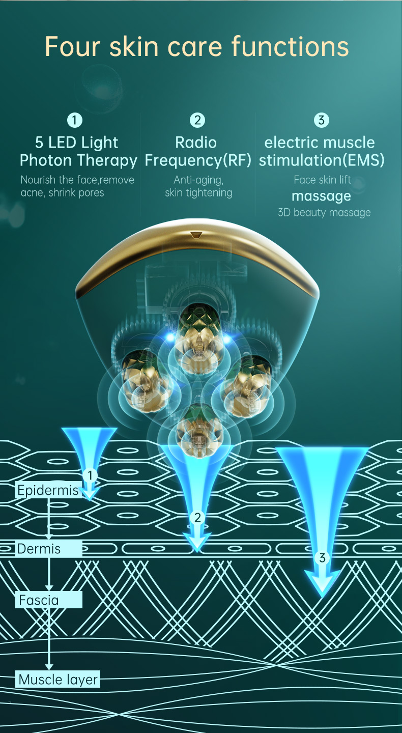 MI AZ ELŐNYÖK? -- A Beauty Machine egy többfunkciós öregedésgátló eszköz, amely rádiófrekvenciás (RF) technológiát tartalmaz vörös/kék fényterápiával, EMS-t a vonalak és ráncok csökkentésére, javítja a bőr behatolását és a felszívódási képességét stb.