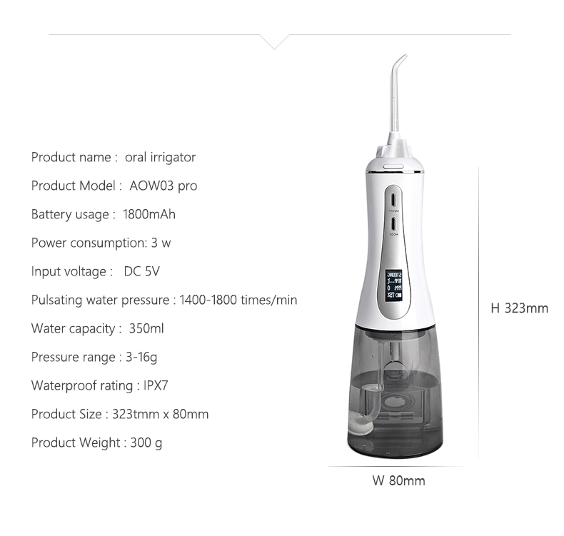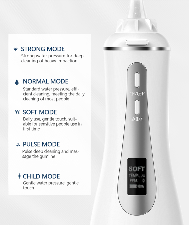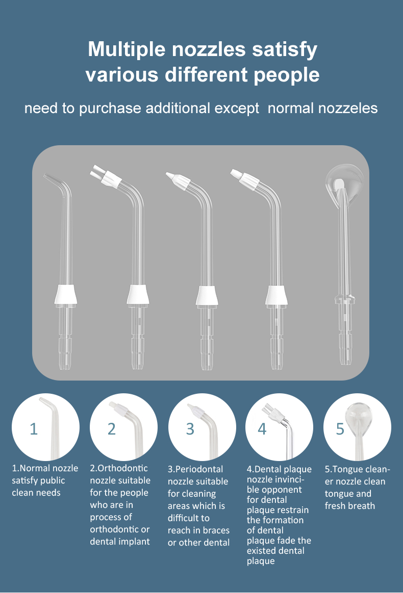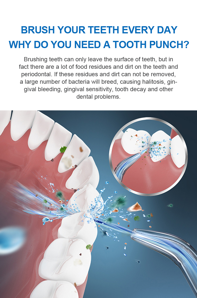Ez a vizes fogászati csákány nagy víznyomású impulzusokat bocsát ki percenként 1400-1800-szor, hatékonyan eltávolítva a lepedék 99,9%-át a fogak mélytisztítása érdekében. Ez a vizes fogászati csákány masszírozza az ínyt, serkenti a vérkeringést, és megoldja a szájproblémákat, mint a rossz lehelet, a fogszabályozás