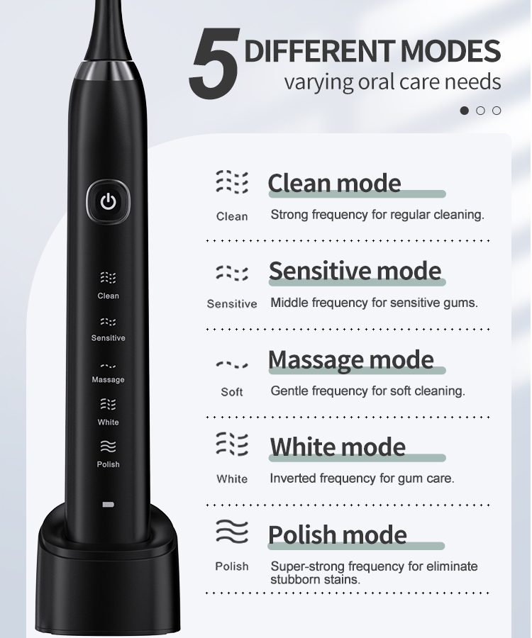 - 5 NAGY TELJESÍTMÉNY MÓDOSÍTÁSI MÓD – Tiszta (gyengéd), fehér (erős), fényes (erős invert frekvencia), enyhébb (enyhe invertált frekvencia) és Érzékeny (lágy), hogy megfeleljen az íny fogainak különböző állapotainak, így különböző módokat választhat. az Ön preferenciái és a fogorvos ajánlása szerint.